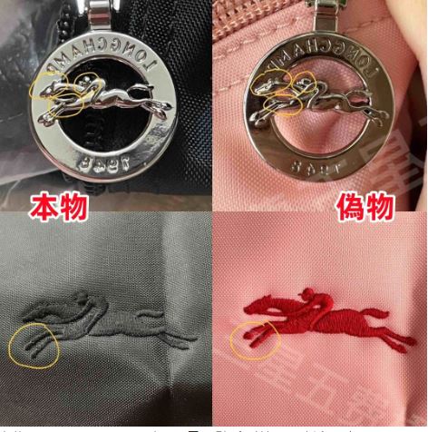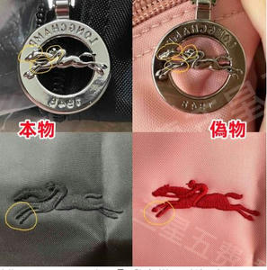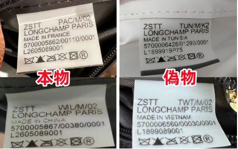 本物には必ず正確な型番、製造国、素材表示が記載されたタグが付いています。これらの情報はロンシャンの公式記録と一致しており、偽物では番号が間違っていたり、フォントが異なっていたりする場合があります。